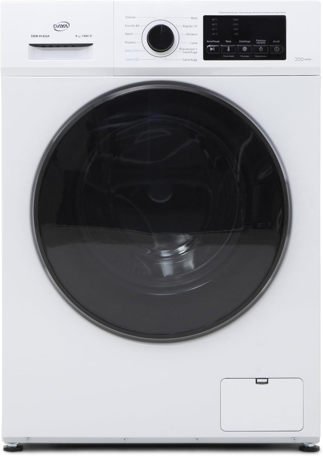 Daya DSW-91423A Lavatrice Carica Frontale 9 kg, 1400 Giri/min, Classe Energetica A, Motore BLDC Inverter, Programma Vapore, Baby Care, Partenza Ritardata, Controllo Touch, Colore Bianco