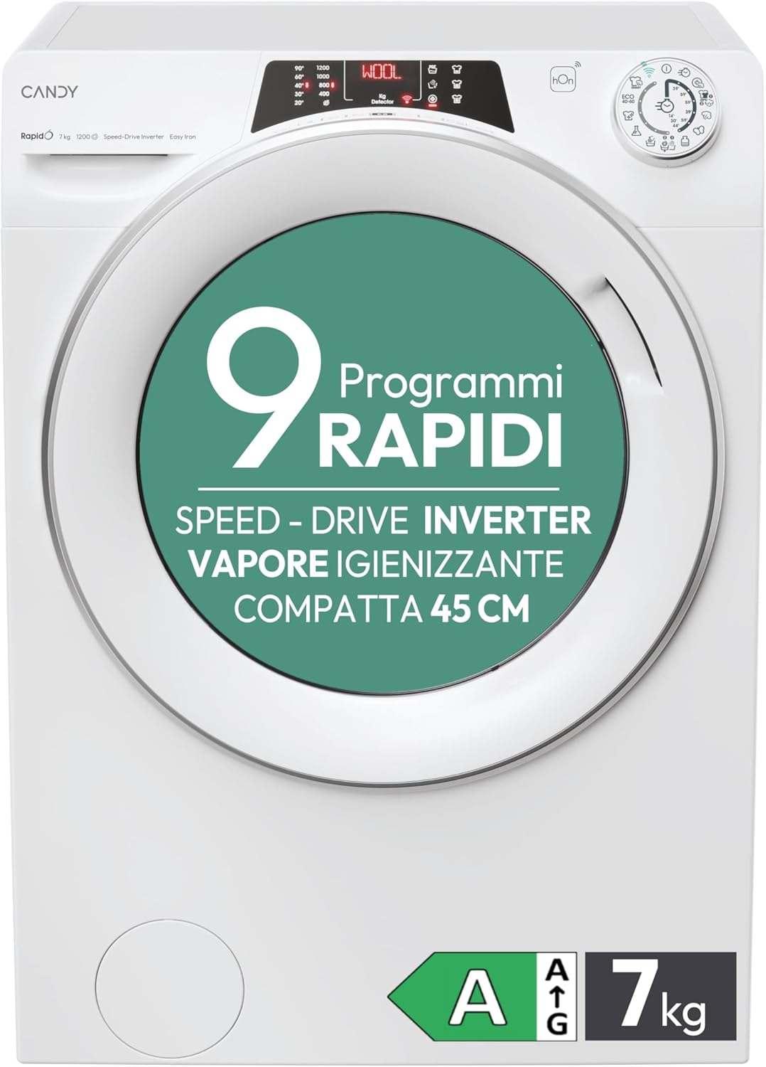 Candy RapidO RO4 1274DWMST/1-S Lavatrice Slim Carica Frontale 7 kg, 1200 Giri/min, Classe Energetica A, 9 Programmi Rapidi, Funzione Vapore, Wi-Fi + BLE con App hOn, Libera Installazione, Colore Bianco