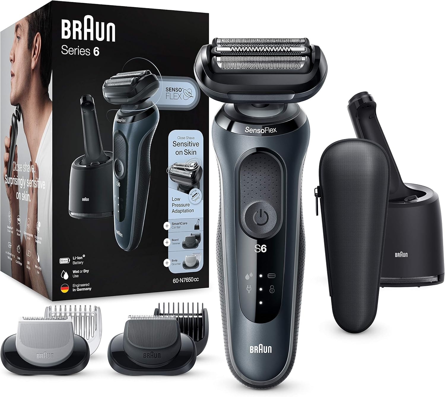 Braun Series 6 60-N7650cc Rasoio Elettrico Uomo Wet & Dry con Stazione SmartCare, Regolabarba e Rifinitore Corpo, Testina Pivotante, Batteria Ricaricabile 50 Minuti, Grigio