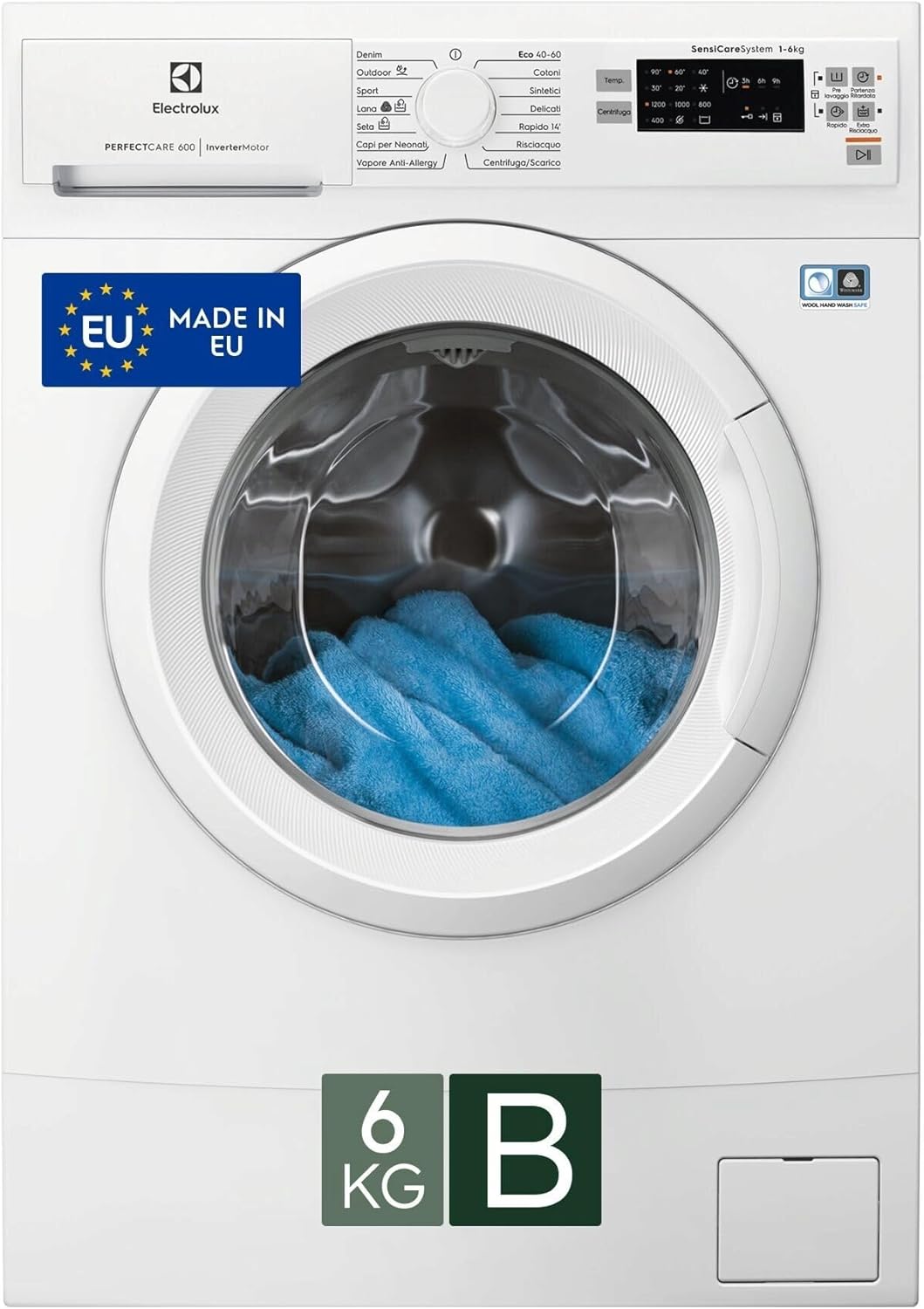 La tecnologia SensiCare regola automaticamente durata del ciclo, consumo di acqua ed energia in base al carico di bucato.