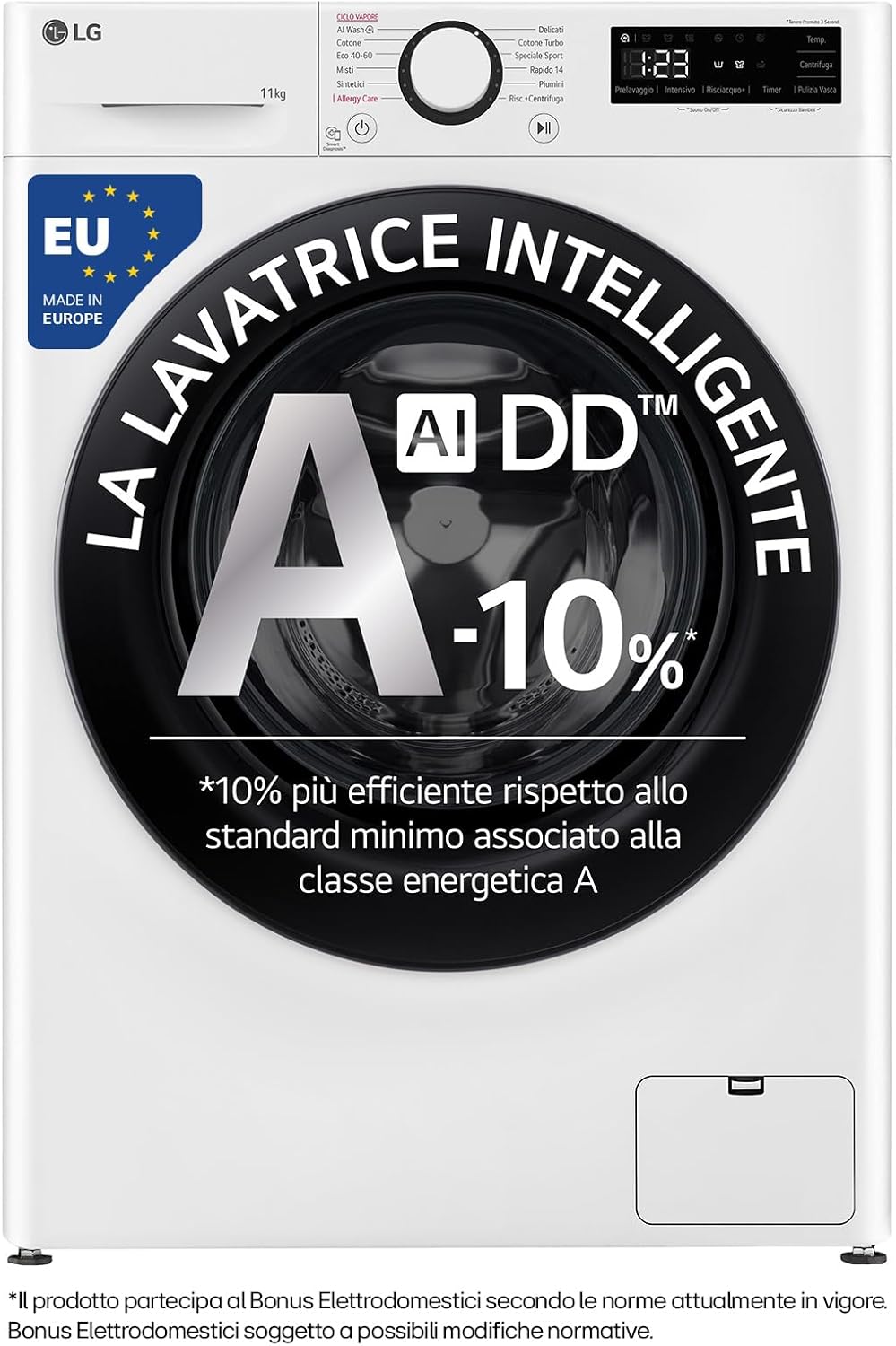 Capacità di carico fino a 11 kg, ideale per gestire grandi quantità di bucato e adatta alle esigenze delle famiglie.
