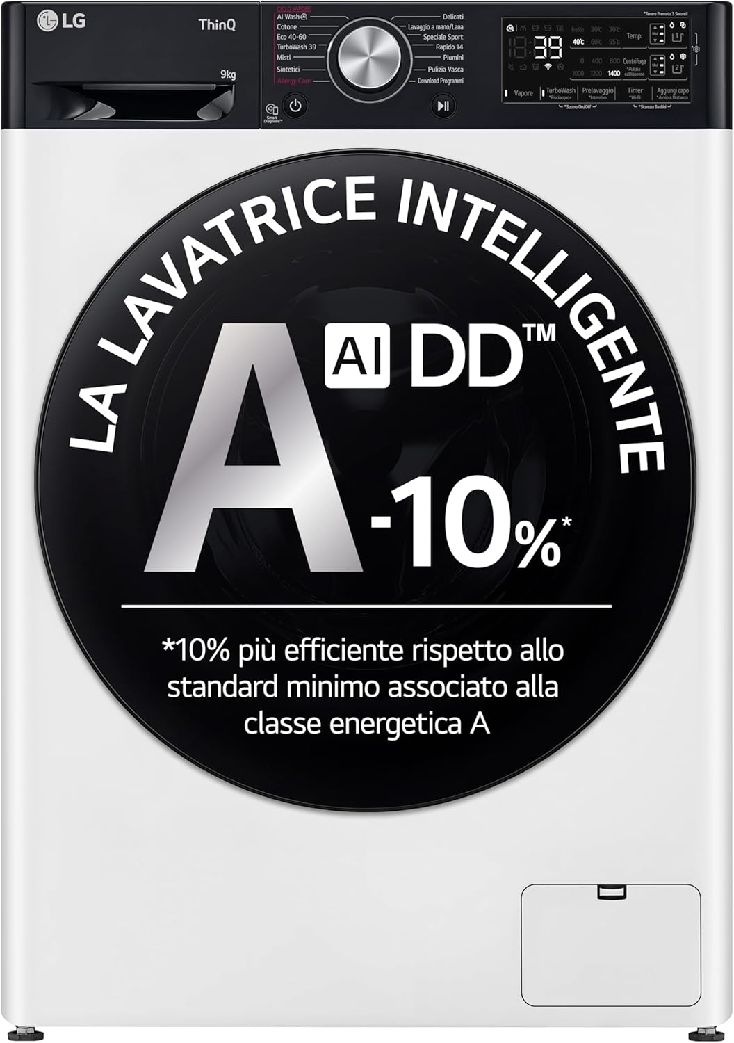 La tecnologia AI DD rileva il peso e il tipo di tessuto per ottimizzare i movimenti del cestello e migliorare la cura dei capi.