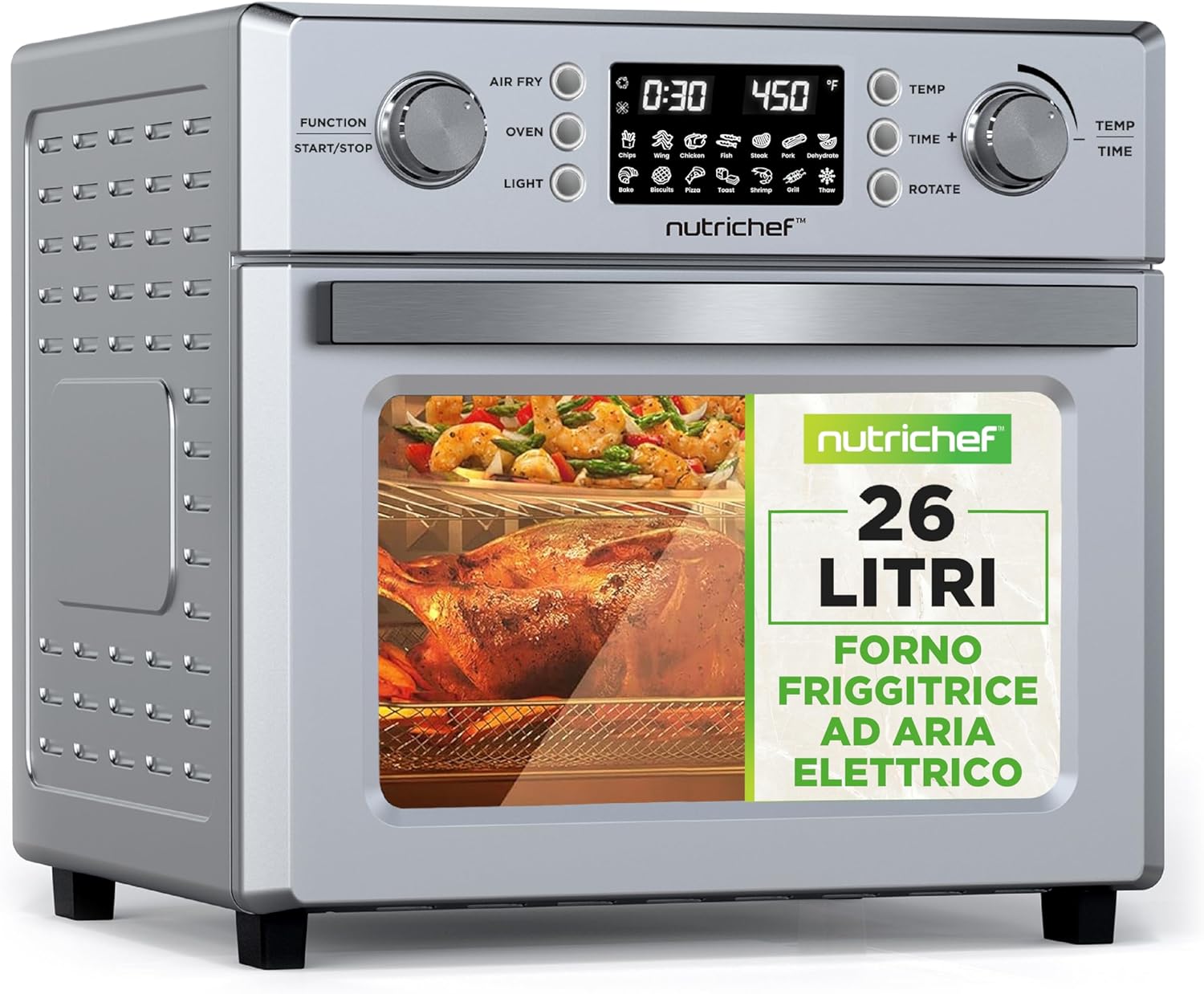 Forno friggitrice ad aria NutriChef con funzione girarrosto a 360°, progettato per offrire diverse modalità di cottura in un unico dispositivo multifunzione.