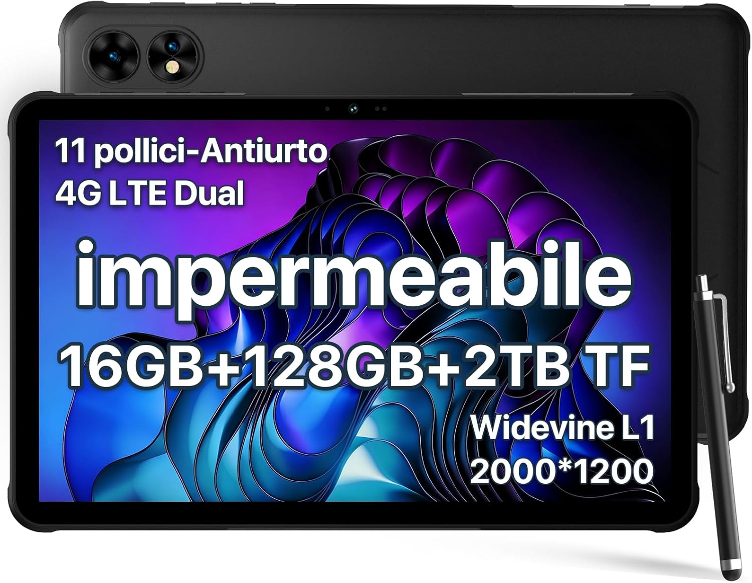 Schermo da 11 pollici con risoluzione massima di 2000 × 1200 pixel, progettato per offrire immagini chiare e dettagliate durante la visualizzazione di contenuti o l’utilizzo di applicazioni.